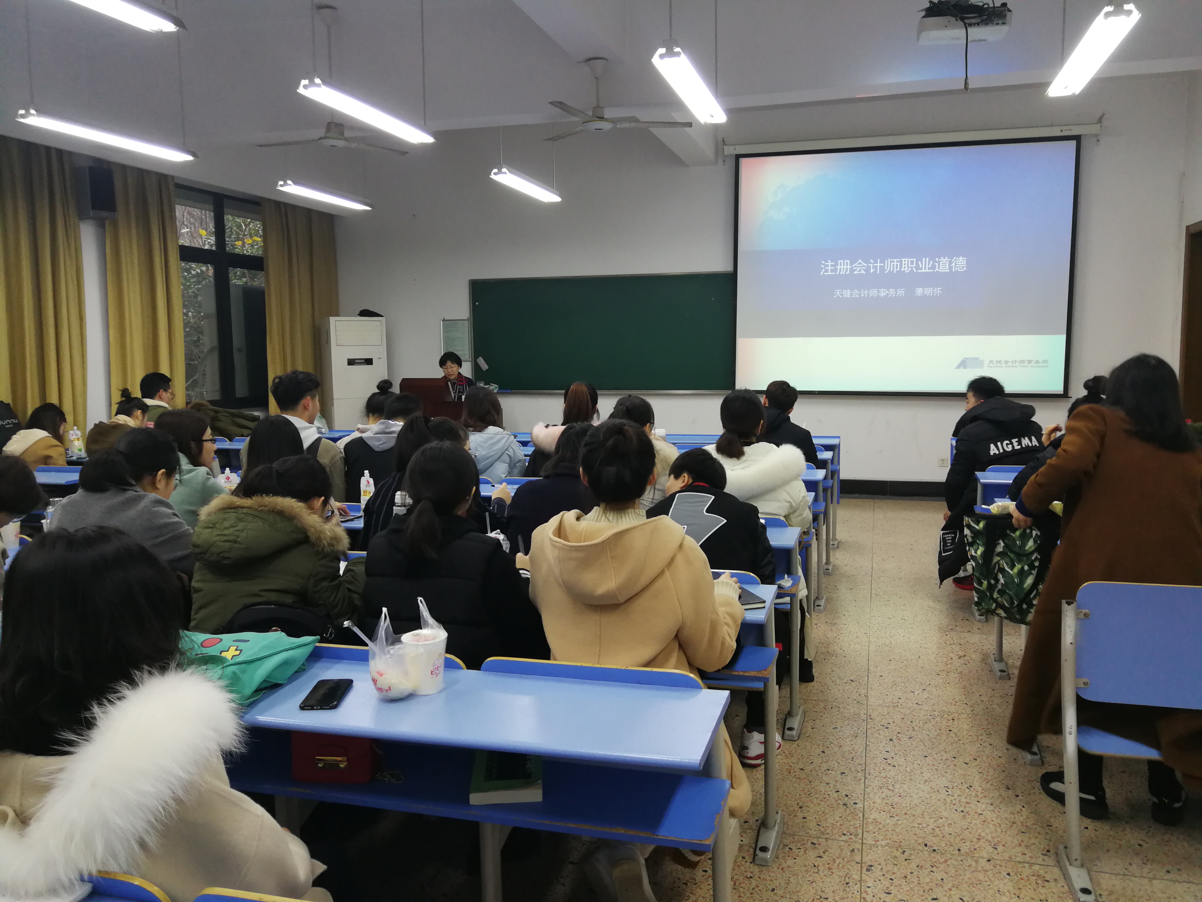 12月23日上午在管理楼109教室,我院特邀请天健会计师事务所高级经理、浙江天健财经学校副校长董明怀女士作为主讲人举行专题讲座《注册会计师职业道德与职业判断》,2018级非全日制研究生参加本次讲座。